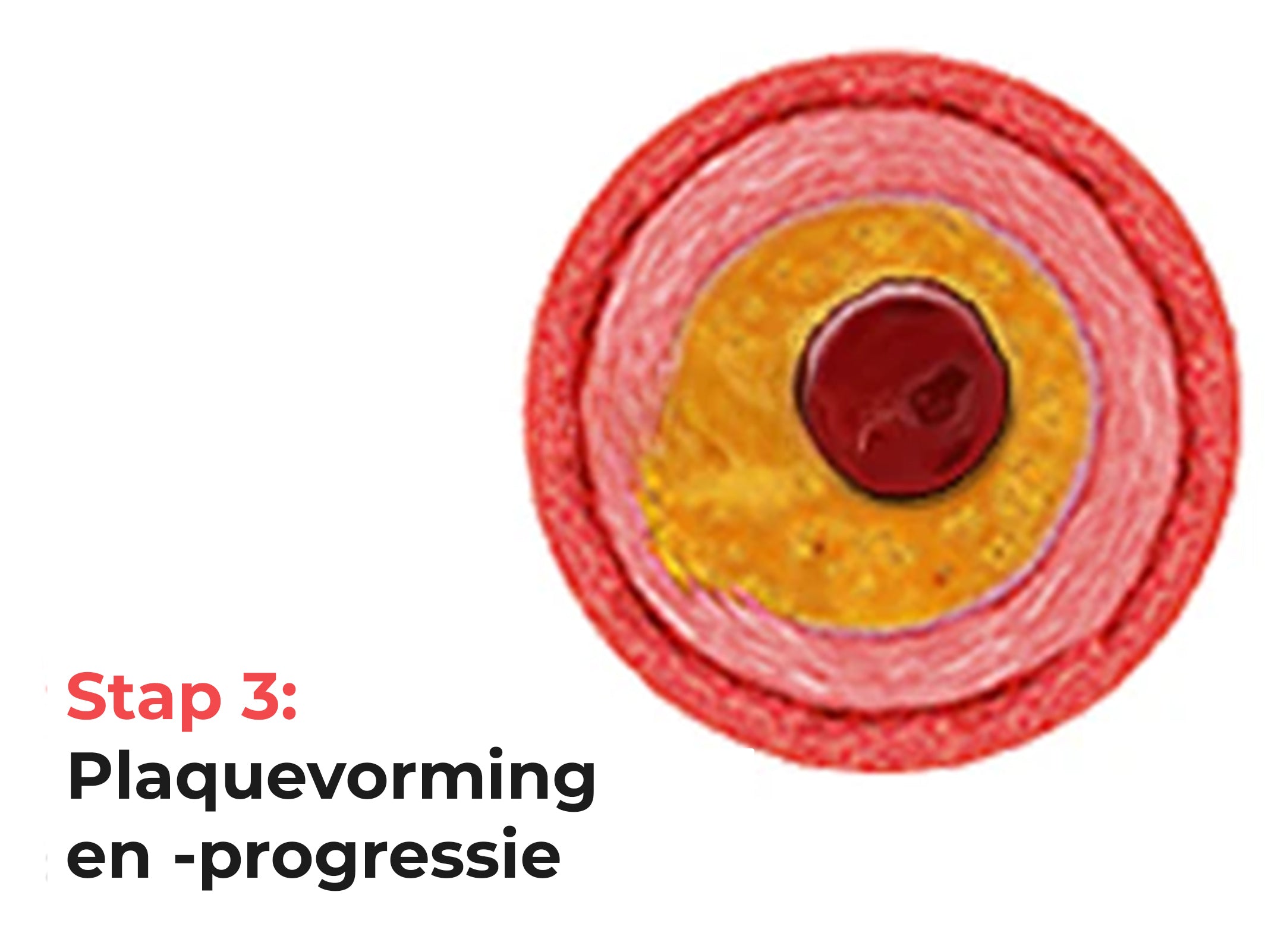 Dit is het begin van plaque. Naarmate dit proces zich voortzet, kan de plaque groeien, de slagader vernauwen en zelfs laten scheuren, waardoor bloedstolsels ontstaan die de bloedsomloop volledig blokkeren.