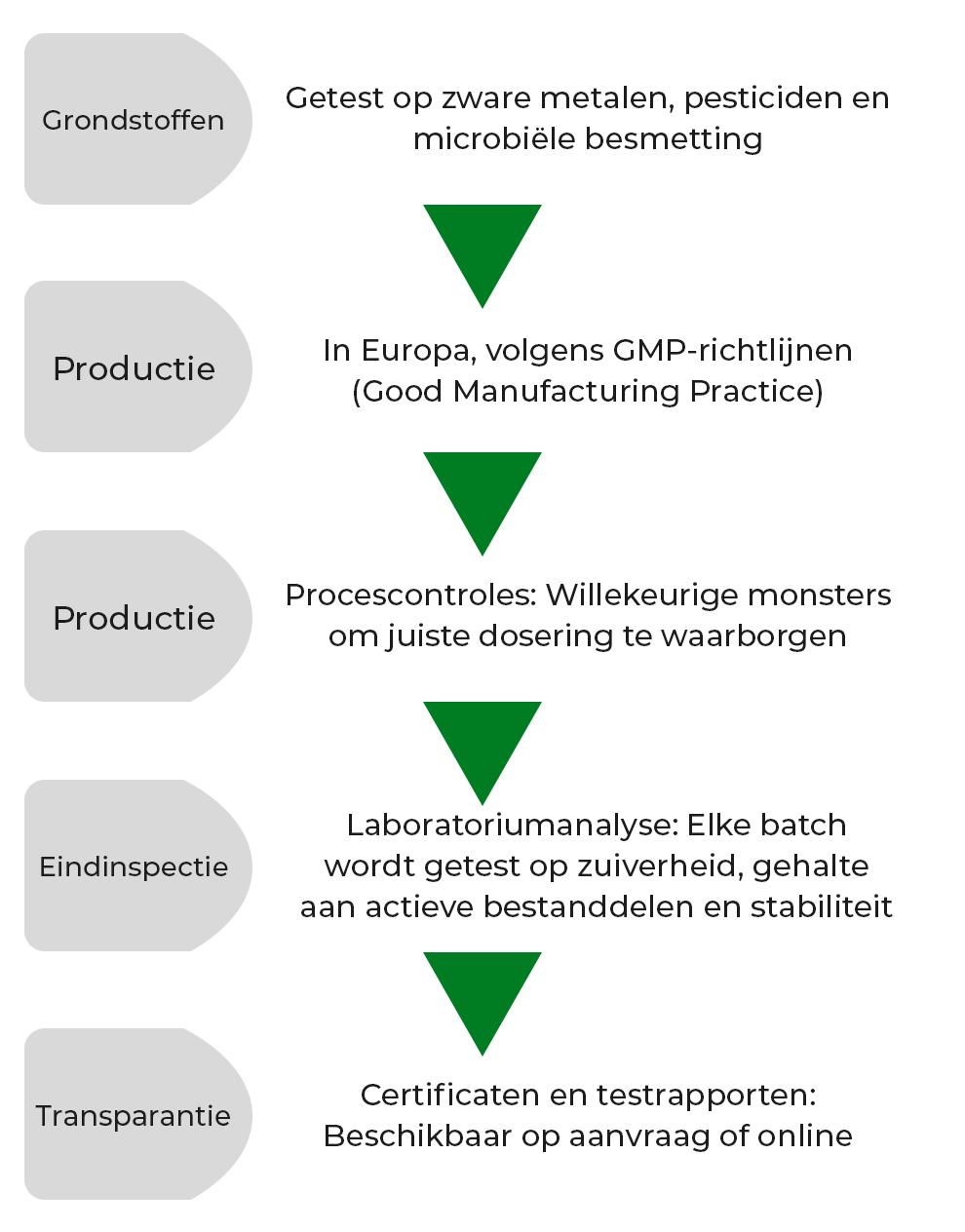 Elke batch wordt getest op zuiverheid en kwaliteit, om ervoor te zorgen dat de ingrediënten in de optimale dosering aanwezig zijn.