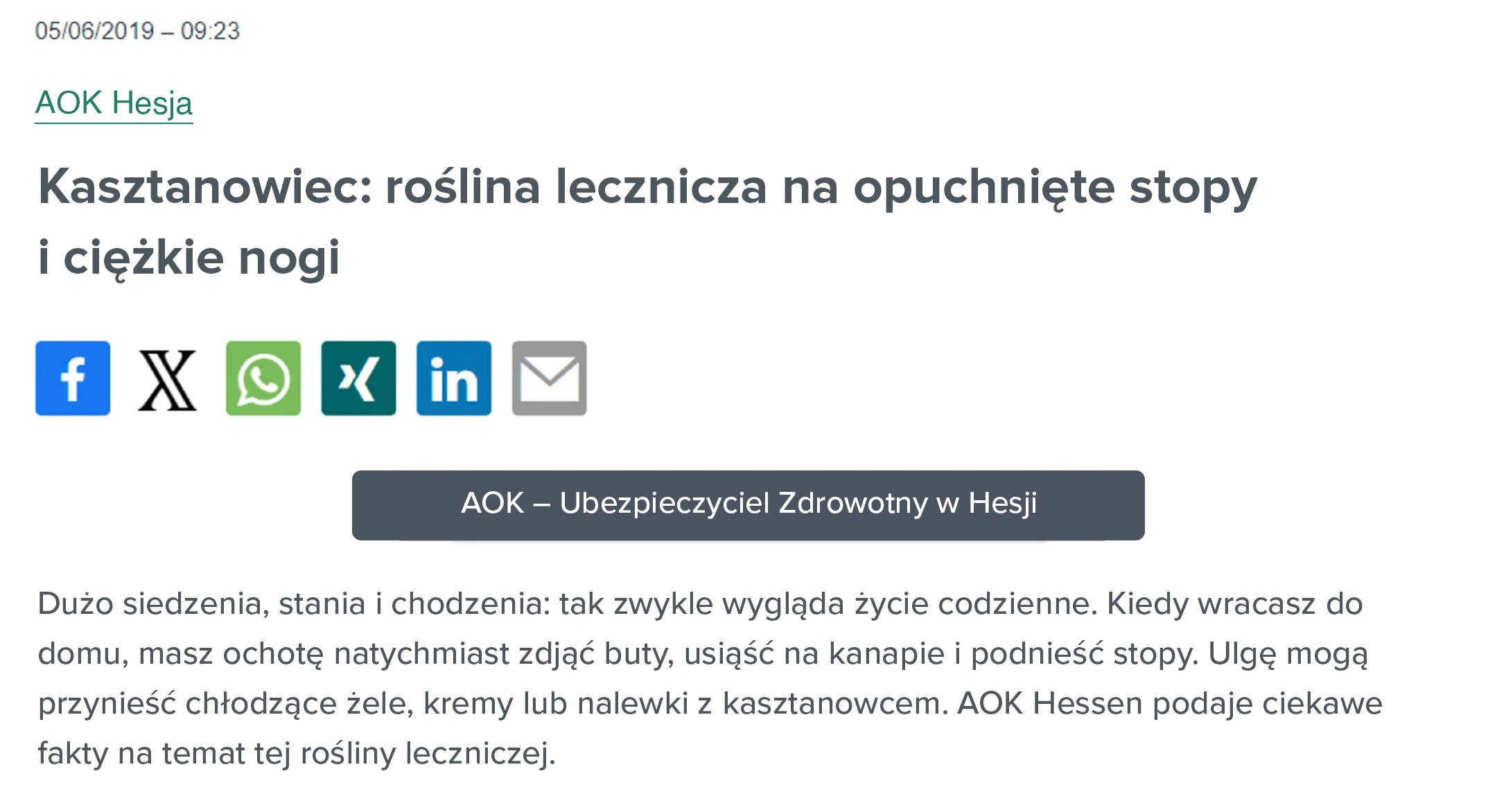 Kiedy później sama zgłębiałam temat, trafiłam nawet na artykuł kasy chorych AOK Hessen, w którym ekstrakt z kasztanowca polecany jest jako domowy sposób na zatrzymanie płynów i uczucie ciężkich nóg: