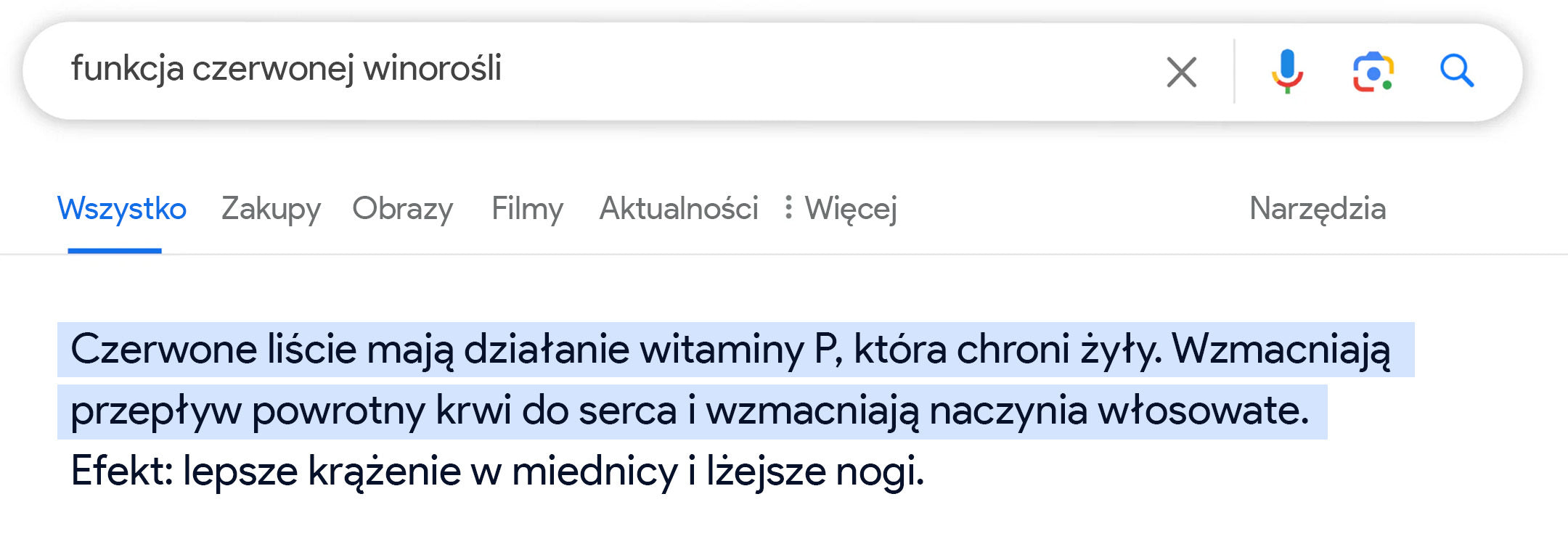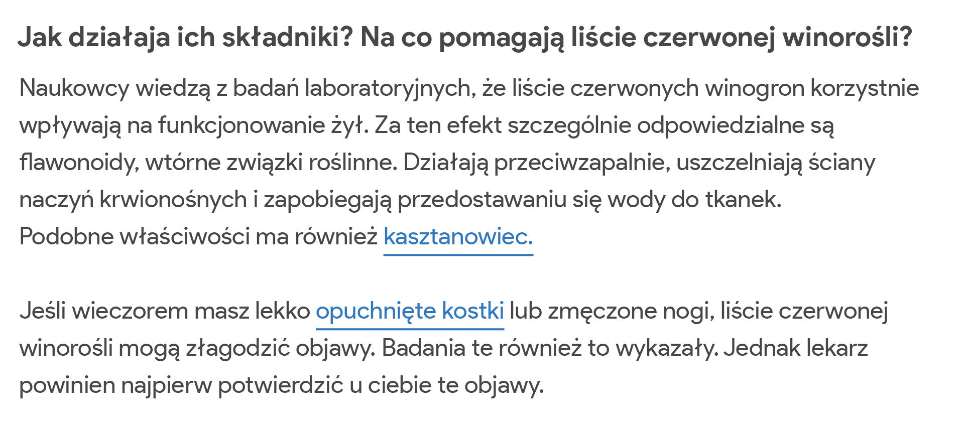 Jeśli jednak wpiszesz w Google, znajdziesz wiele wyników mówiących, że ekstrakt z liści czerwonej winorośli jest bardzo dobry na żyły.