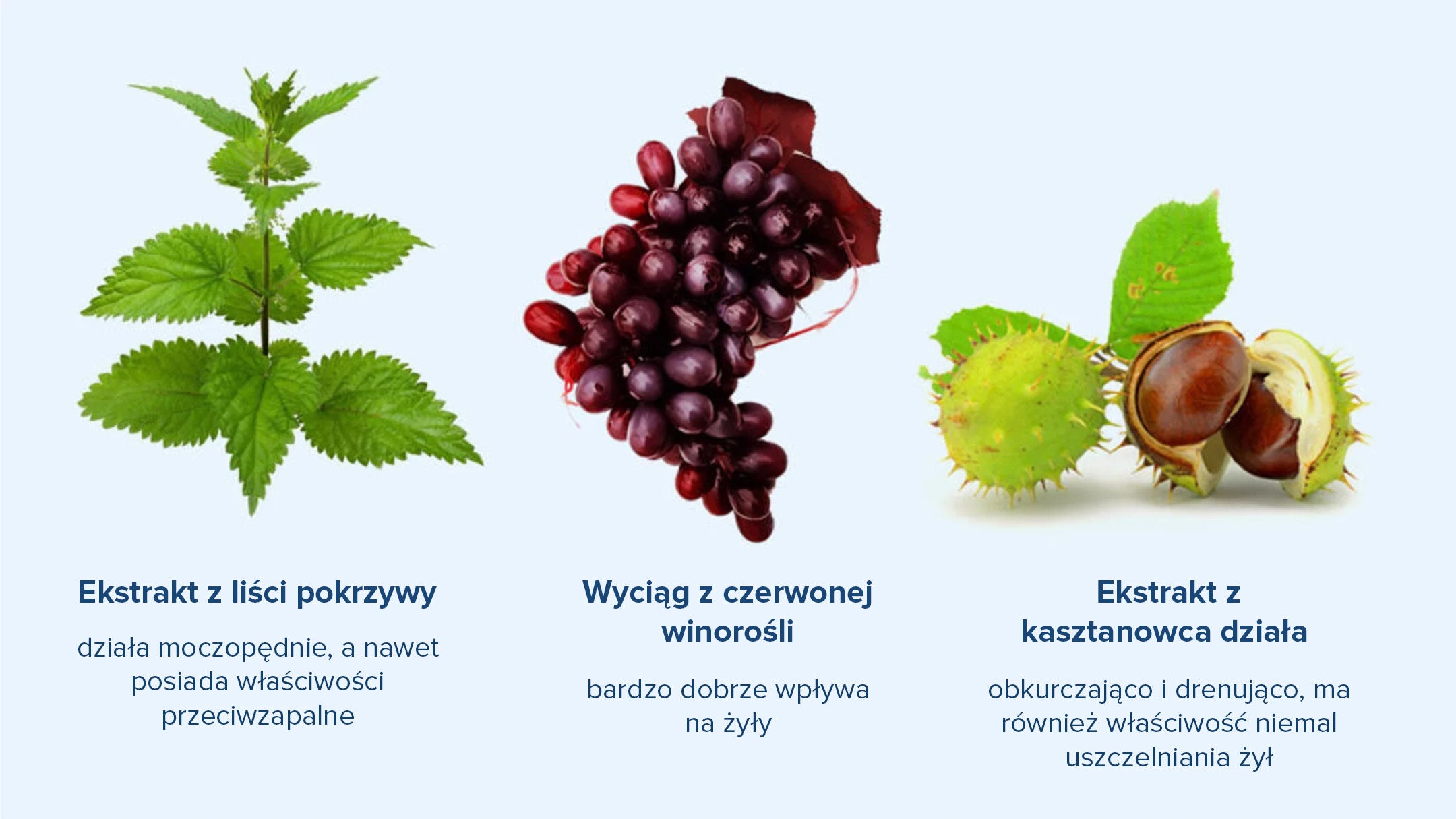 Dzieje się tak dlatego, że ekstrakt z kasztanowca i ekstrakt z liści czerwonej winorośli wzmacnia żyły, tkankę łączną i naczynia krwionośne.